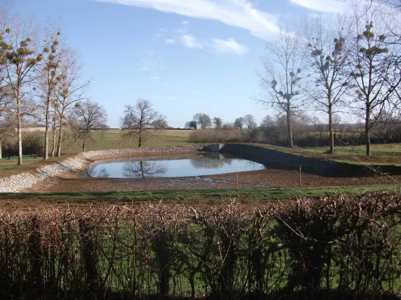 Spécialisés dans les travaux hydrauliques, nous réalisons la création de bassins de rétention, d’étangs et de plans d’eau naturels. Ces ouvrages permettent de réguler les eaux pluviales, d’embellir votre terrain et de préserver l’équilibre écologique de votre environnement.